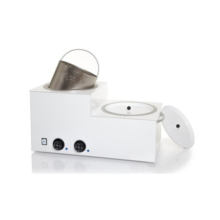 El calentador cuenta con dos depósitos independientes controlados por termostatos de bulbo, ajustables de 0 a 120 grados, lo que permite calentar diferentes tipos de cera a la temperatura óptima para cada tratamiento. El filtro de aluminio, con una rejilla inferior y asa, facilita el reciclado de la cera, optimizando su reutilización.