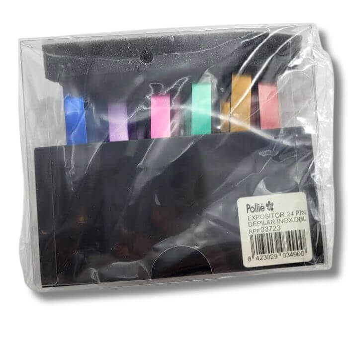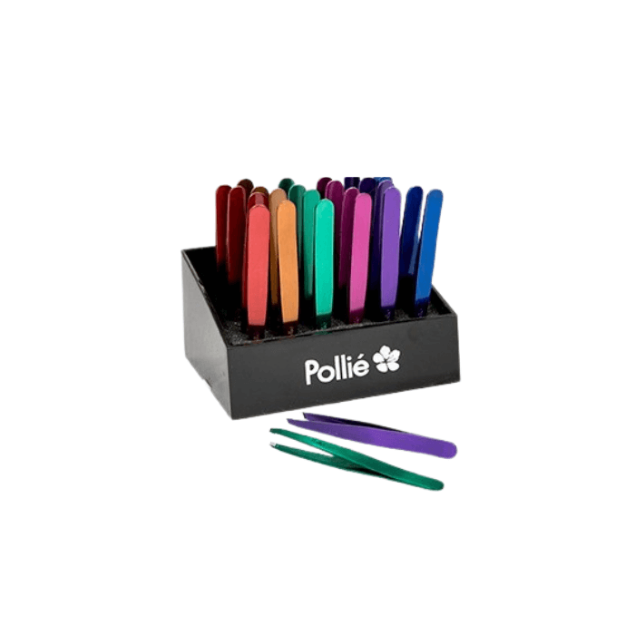 | Expositor 24 pinzas oblicuas color de depilar Polllié | Caja de plástico | Para tratamientos |
